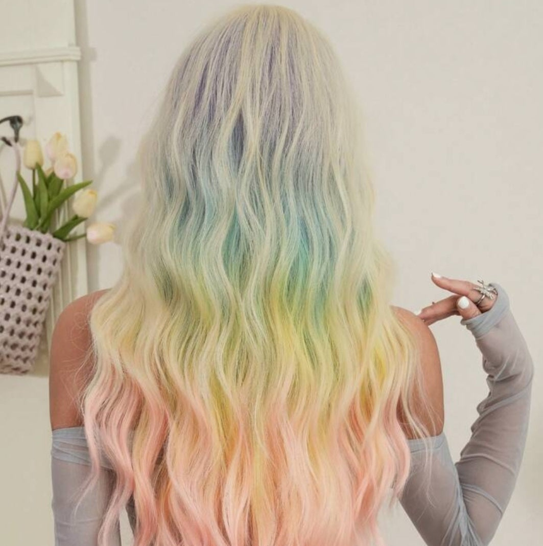 A breathtaking 24" of rainbow-kissed waves flowing from a soft blonde crown into a full pastel ombre of blue, teal, yellow, green and blush pink - Sugar doesn't just turn heads, she'll have you hooked in seconds.