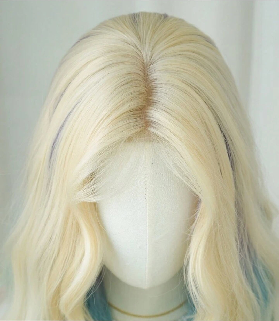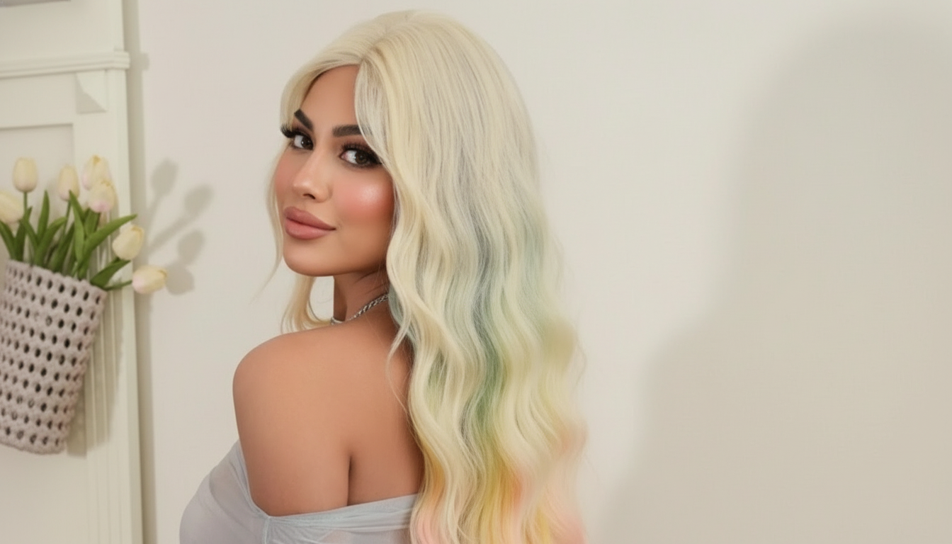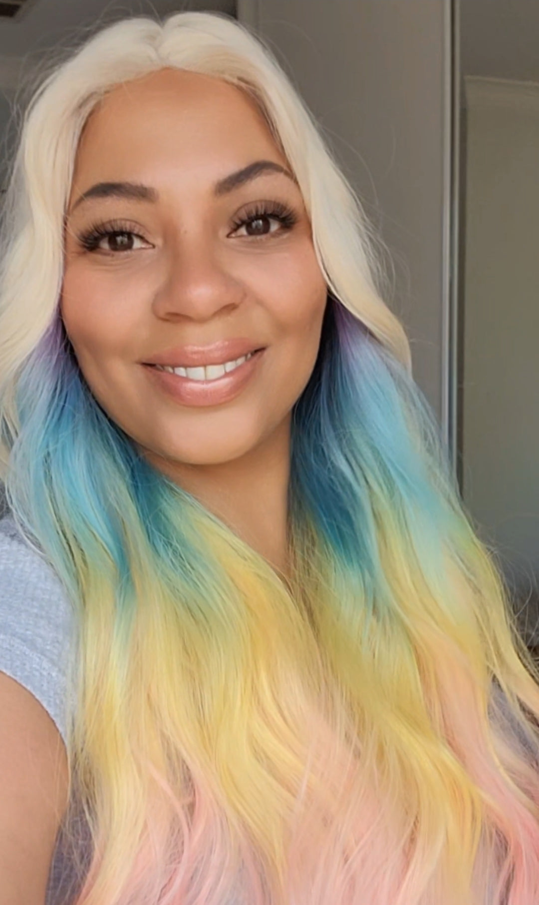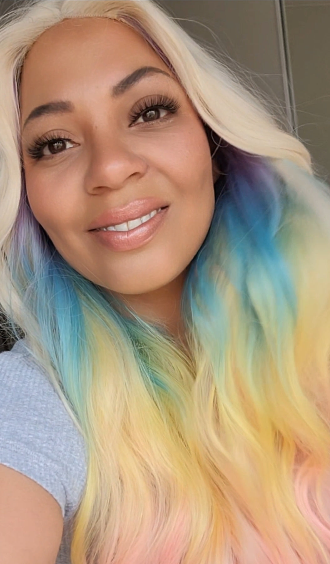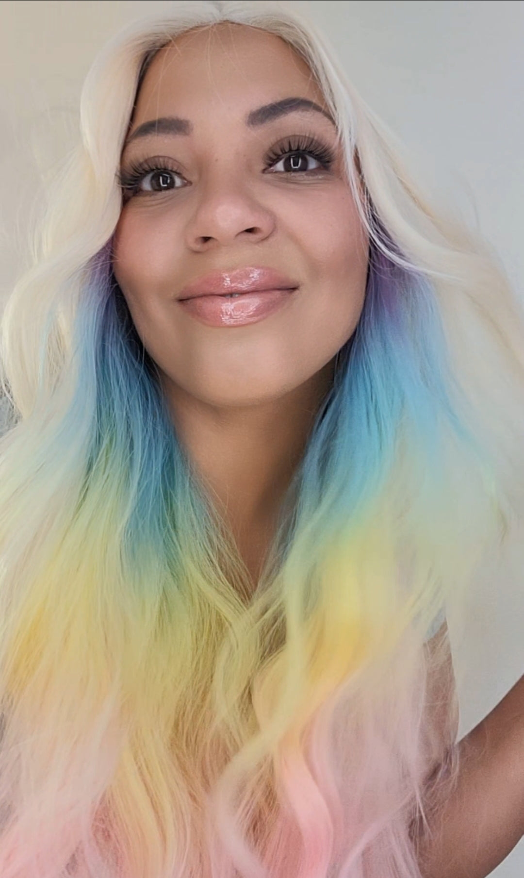 - Stunning pastel rainbow ombre 🌈 from blonde crown to pink, teal & yellow ends